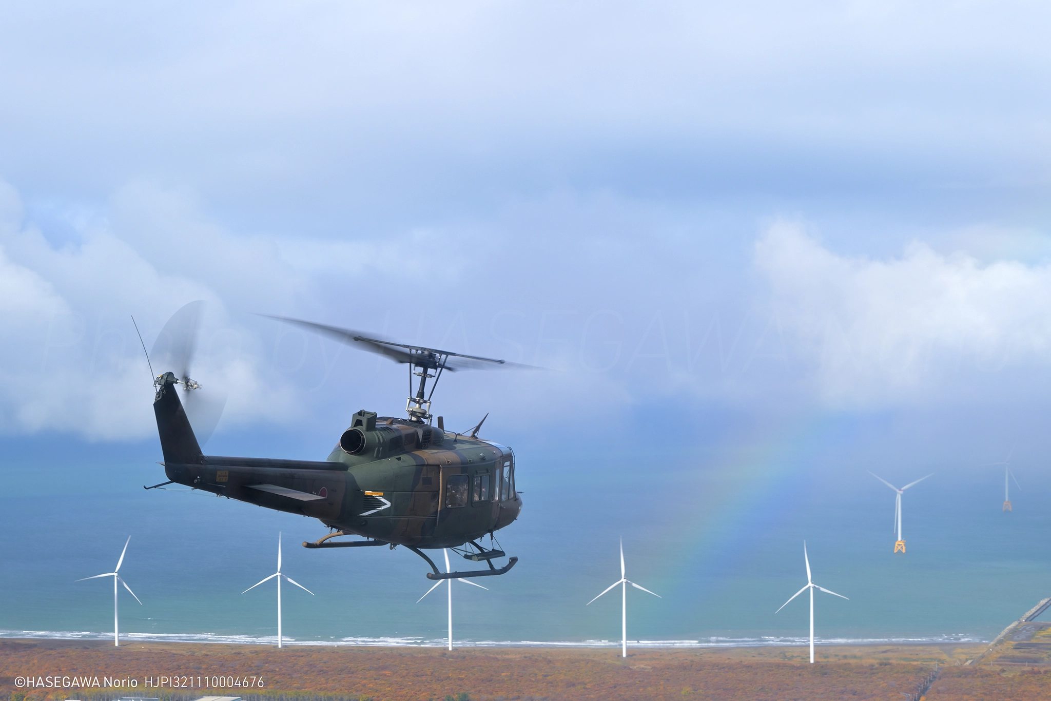 なにせフライトタイム10分と言われていたので、「どこまで、何が撮影できるかな?」と思いながらの搭乗でしたが、「虹とUH-1」の図が撮れたので言う事はありません。